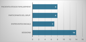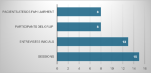 D’aquestes 8 famílies, una va decidir a última hora no començar. Era una mare que ja havia participat l’any anterior. Una altra, que també era de l’any anterior, va tornar a treballar i no veia possible ni iniciar el grup. Així que han quedat 6 famílies que són les que han sigut ateses grupalment. Com a característica interessant, s’ha de dir que hi ha un matrimoni que ja estaven l’any anterior i els dos pares d’una altra jove. Per tant, han sigut 8 membres en el grup. S’han realitzat 7 entrevistes inicials, ja que algunes famílies venien del grup anterior i no vaig valorar necessari tornar a fer entrevista individual.